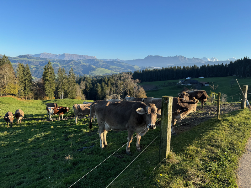 So lande ich unten im “real Emmental”, wo ich bei Dieboldswil kurz die Emme quere um auf der anderen Seite gleich wieder hochzukurbeln in Richtung Netschbühl, dass ich noch von einer Landschulwoche während meiner ordentlichen Schulzeit her “kenne” (…die Erinnerungen daran sind nur noch bruchstückhaft… ist ja auch schon ein gutes halbes Jahrhundert her… 😉 ), und wo sich die Mädels gleich wieder an den Strassenrand stellen um mit mir zu plaudern…!